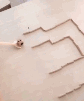 将若干小木刺拼成一个迷宫,用木叉推着骰子沿迷宫的路线成功走出,即为胜利。