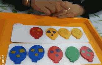 ①任意拿出四块形状棋,观察它们的共同点——其中三块形状棋的颜色一样,即都是黄色。然后将不同的那块棋拿走。