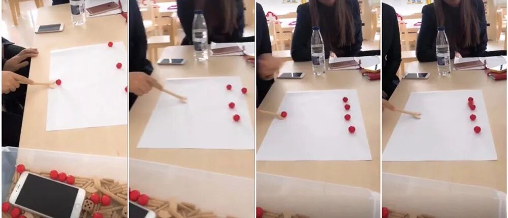 取3颗苹果排成一列作为“火线”,每颗苹果之间的空隙要一样,再取1颗苹果作为“冲锋车”,用木叉将“冲锋车”用力推出,要从一排苹果的空隙中穿梭过去而不碰到苹果,即为胜利。教师还可以适度增加游戏的难度,如取4颗苹果排成一列,或者由大到小逐渐调整苹果之间的空隙。