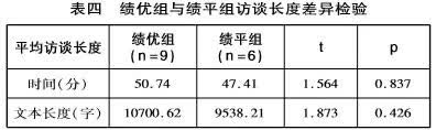 绩优组和绩平组的平均访谈时长及文本长度见表四,对两组访谈时间和文本长度进行独立T检验,结果显示两个组别没有显著差异(P>0.05),排除了访谈长度对两组胜任力分析的影响。