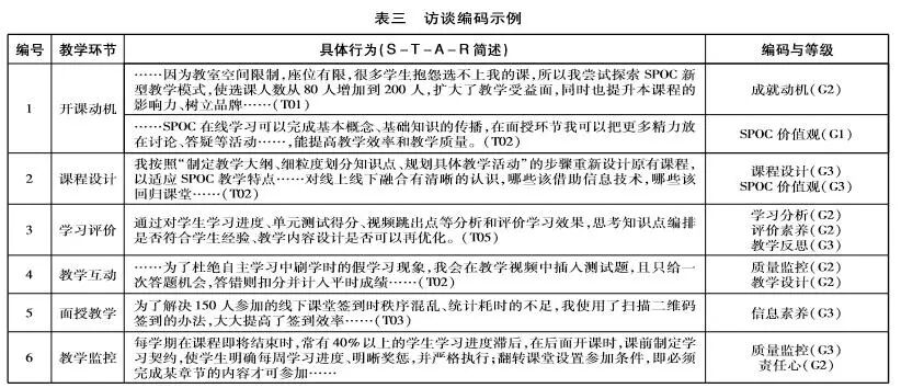 本研究根据实际条件采用现场访谈和微信视频访谈相结合的方式,让受访者回忆自己开设SPOC以来的教学经历,对印象最深刻(认为最成功或最具挫败感)的教学事件(或教学环节)进行叙述,叙述方法采用STAR法(李德方,2015),即包括事件发生的情境、要解决的任务、采取的行动、处理结果及影响等,尽可能确切回忆当时的对话、行动和结果。采访者使用探测技术深入询问、了解事件,对访谈对象的评价基于其行为表现,而非个人的主观感受或直觉。