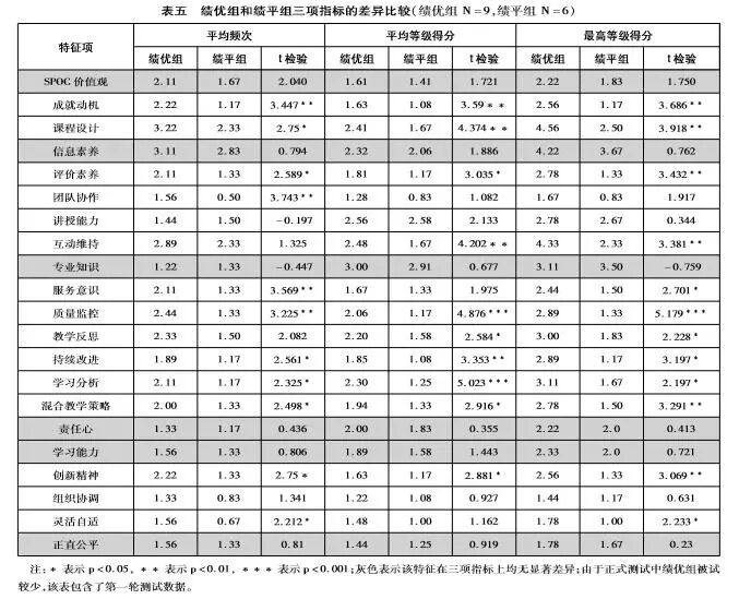 结果显示,两组别共有10项胜任力差异具有统计学意义(P﹤0.05),且绩优组得分明显高于绩平组,说明在这些胜任力特征上绩优组比绩平组的正向性得分更高;采用平均频次指标,共有三项新的胜任特征(团队协作、服务意识、灵活自适)差异具有统计学意义(P﹤0.05)。据此获得SPOC混合教学教师鉴别性的胜任力要素共13项,具体为:课程设计、信息素养、评价素养、成就动机、服务意识、互动维持、质量监控、教学反思、学习分析、混合学习环境设计。