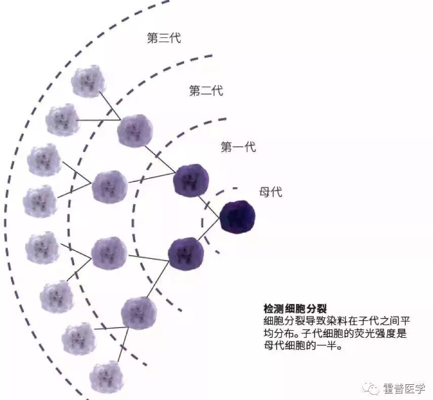 可以利用亲脂性染料来标记我的细胞膜,以识别和跟踪我。比如细胞增殖染料(CPD)eFluor® 670可以在体内跟踪未分裂的细胞数周。该染料与细胞蛋白质形成共价反应。随着细胞分裂,该染料会均分到子代细胞中,荧光强度减为原来的一半。
