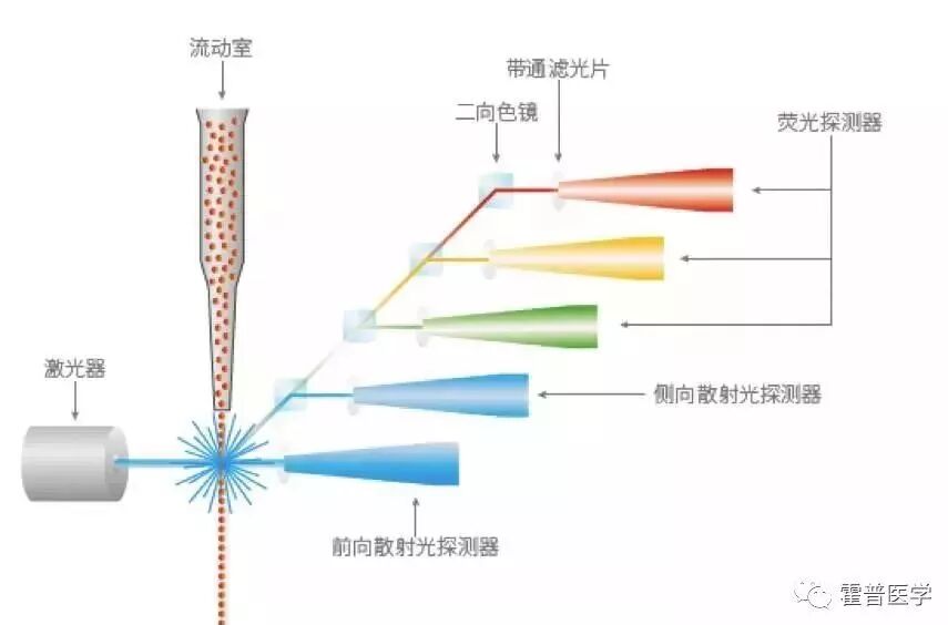 想要被流式细胞仪辨认,需要用各种荧光染料(荧光结核抗体)对我进行标记。激光器能够发射用来激发荧光染料的特定波长的光线,荧光染料吸收光线之后,发射出可以被流式细胞仪检测的荧光。