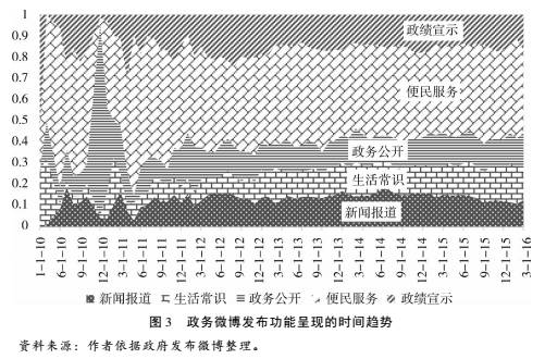 从时间趋势来看(图3),政务微博的主要功能经历了明显波动后逐渐形成稳定的功能构成。便民服务的比例变动最大,在2010年政务微博初创阶段,便民服务内容的比例波动较大,2011年中才开始稳定并持续下来。政务公开所占比例也经历了一个较为剧烈的变动。在2010年末,政务公开急剧上升,成为主体内容,但进入2011年中该比例迅速降低并稳定在10%。而生活常识信息也从最初比重剧烈波动至缓慢增长,达到15%左右。政绩宣示的发帖比重在2010年到2016年间波动较为剧烈,从最初的50%下降到20%左右。