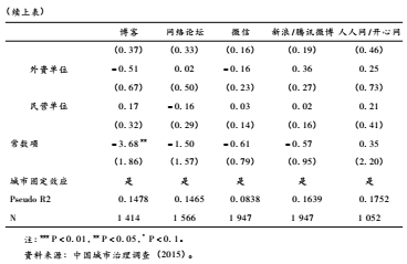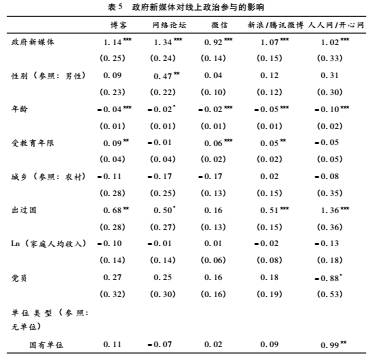 。调查中测量了网民在一系列网络平台就公共事务发表言论的行为,。考察所有回归模型,可以发现,利用政府新媒体的网民在所有主要网络平台上均发表出更多参与偏好。与未关注政府新媒体的网民相比,关注政府新媒体的网民显著地更多在博客、网络论坛、微信、新浪/腾讯微博、人人网/开心网等主要社交平台上就国家大事或公共事务发表评论,而且其影响效应较大。同时,我们也发现,,而教育水平则与之正相关。,出过国的网民比未出过国的网民的参与水平显著更高。简言之,网民对政府新媒体的应用显著提升了网民参与公共事务的兴趣及行为,这为网民与政府在网络空间展开充分互创造了前提条件。