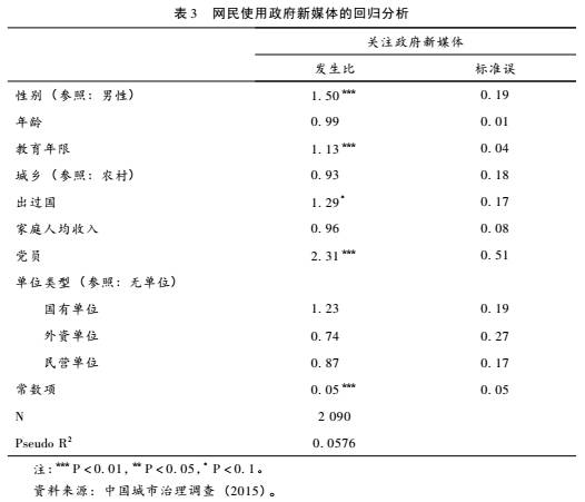 ,、偏好和行为的机制性研究还很匮乏。由此,这部分从网民(受众)角度来评估政府新媒体的影响。首先来考察网民使用政府新媒体的情况。问卷调查询问了受访者是否关注了政务微博/微信,结果显示16%的网民关注了政务微博/微信。那么,政府新媒体之影响评价的首要工作是辨识政府新媒体的“受众”与“非受众”,即回答哪些人群偏好应用政府新媒体。“受众”指应用政府新媒体的人群,而“非受众”指政府新媒体尚未有效干预的人群。识别政府新媒体的“受众”与“非受众”对于评价政府新媒体的影响效应、影响策略及政府新媒体未来发展都具有指示器效应。表3呈现了对政府新媒体受众进行逻辑斯蒂回归的结果。
