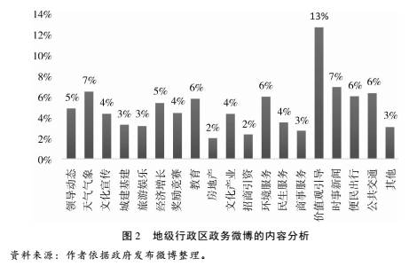 首先来讨论政府新媒体的传播内容。传播内容反映传播主体单向度输出或扩散的信息主题,凸显政府新媒体的传播主旨内容。一般认为政务微博以转发公文为主,复制门户网站内容,使得民众对政务微博缺乏兴趣。图2显示,政务微博发布内容非常多元,价值观宣传类发布最多,容易引发网民共鸣,包括价值观引导、文化产业、文化宣传;其次是民生服务类信息,诸如天气气象、便民出行、公共交通、环境服务、教育等服务,比较贴近民众生活;再次是时政消息类,如时事新闻、领导动态等活动报道;最后是经济增长类,如旅游娱乐、城建基建、商事服务等。