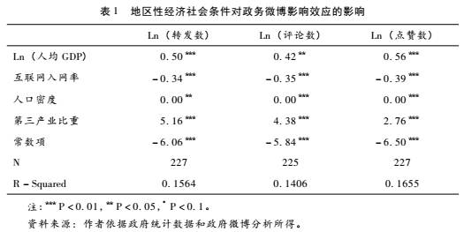 我们构建了一个地区性经济社会条件对政务微博影响效应的线性回归模型,考察地区经济发展、互联网接入率、人口密度、服务业发展状况等对政务微博影响效应的影响。结果如表1所示:经济发展水平越高,政务微博的影响效应就越强;互联网入网率越高,其影响力反而变弱,这可能是因为互联网入网率越高的地方网络声音更多元,政务微博面对更多的社交媒体竞争对手;人口密度越高的地区,城镇化水平越高的地区,政务微博的影响效应也越强,这源于高人口密度地区对公共服务的需求及期望更高;第三产业比重越高,表明该地区的社会经济发展水平较高,政务微博的影响效应就越强。