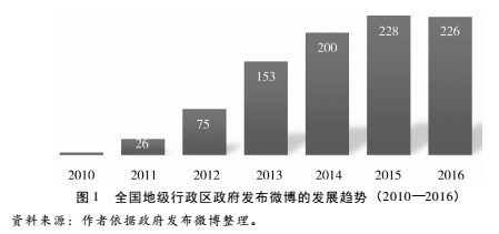 ,本文基于海量政务微博资料开展大数据分析。通过网络爬虫软件,本文采集了全国334个地级行政区的政务微博数据展开分析。选择地级行政区政府发布微博为研究对象基于三项原因:(1)地级行政区介于省级和县级行政区之间,既具有宏观规划职能,又具有微观管理职能,与公众联系密切;(2)政府发布微博是各地级行政区综合性政务微博,、旅游、交通等专项政务微博更具综合性、权威性和影响力;(3)地级行政区政府发布微博数量众多,可以有效反映政务微博的地区差异。截至2016年4月,全国地级行政区有232个建立了政府发布微博,微博好友总数9万多,粉丝总数累积接近1亿,累积发文202万。简言之,大多数地级行政区建立并频繁使用政府发布微博。