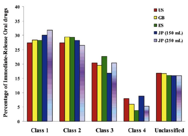 获FDA批准的仿制药高溶解药物占79%,难溶性药物仿制难度大。BCS classification of oral drugs in IR dosage forms on the US、GB、ES、and JP