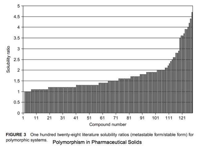 128种药物不同晶型溶解度比值,大部分在1-2倍之间,最高约5倍: