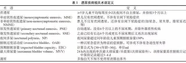 诊断要点包括:①患儿年龄≥5 岁 (5 岁作为判断儿童夜遗尿的年龄标准虽带有一定主观性,但其却反应了儿童排尿控制能力的发育程度);②患儿睡眠中不自主排尿,每周≥2 次,并持续 3 个月以上 (疲劳或临睡前饮水过多而偶发遗尿的儿童不作病态);③对于大年龄儿童诊断标准可适当放宽夜遗尿的次数。与遗尿相关的术语定义见表 1。