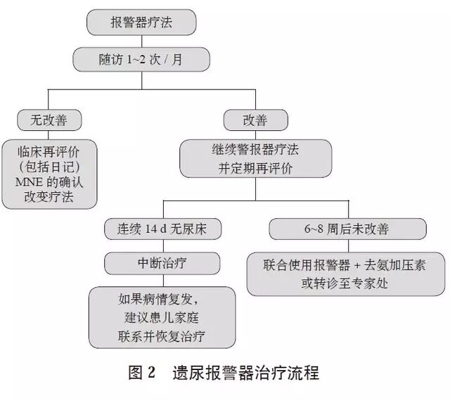 正确的训练指导是成功的关键,并且在实施中监测遗尿情况的变化,利用心理学正性强化技术不断增强家庭治疗的动机,建立一套完整的随访方案,直至治疗成功。使用遗尿报警器治疗成功后应告知患儿,如果病情复发应再次联系医师 (图 2)。