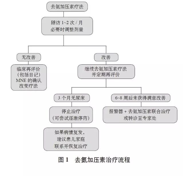 建议初始治疗时每 2 周评价 1 次药物的治疗效果,无改善者应重新评估,包括记录排尿日记等。如果仍有夜间多尿,可以增加去氨加压素剂量。若治疗 6-8 周后对疗程不满意,可联合遗尿报警器治疗或转诊至遗尿专科诊治。