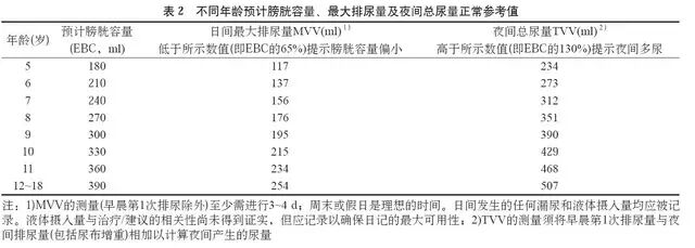 排尿日记中涉及的日间最大排尿量 (maximum voided volume,MVV) 指除清晨第 1 次排尿以外的日间最大单次排尿量,而夜间总尿量(total voided volume,TVV) 应包括夜间尿布增重或夜间排尿量与清晨第 1 次尿量之和。不同年龄预计膀胱容量,最大排尿量及夜间总尿量正常参考值见表 2。