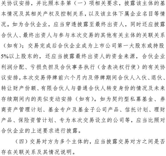 为防范“杠杆融资”可能引发的相关风险,本次修订对合伙企业等作为交易对方时的信披要求做了进一步细化:交易对方为合伙企业的,应当穿透披露至最终出资人,同时还应披露合伙人、最终出资人与参与本次交易的其他有关主体的关联关系;交易完成后合伙企业成为上市公司第一大股东或持股5%以上股东的,还应当披露最终出资人的资金来源,合伙企业利润分配、亏损负担及合伙事务执行的有关协议安排,本次交易停牌前六个月内及停牌期间合伙人入伙、退伙等变动情况;交易对方为契约型私募基金、券商资产管理计划、基金专户及基金子公司产品、信托计划、理财产品、保险资管计划、专为本次交易设立的公司等,比照对合伙企业的上述要求进行披露。