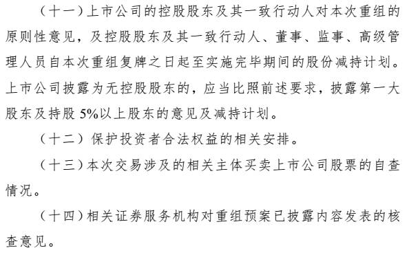 通过简化重组预案披露内容,减少停牌期间工作量,进一步缩短上市公司停牌时间:本次修订明确上市公司在重组预案中无需披露交易标的的历史沿革及是否存在出资瑕疵或影响其合法存续的情况等信息,具体信息可在重组报告书中予以披露;缩小中介机构在预案阶段的尽职调查范围,仅为“重组预案已披露的内容”;不强制要求在首次董事会决议公告前取得交易需要的全部许可证书或批复文件,改为在重组预案及重组报告书中披露是否已经取得,如未取得应当进行风险提示。