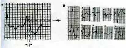 图10 室性早搏的丑征:A.测量方法;B.各型表现。