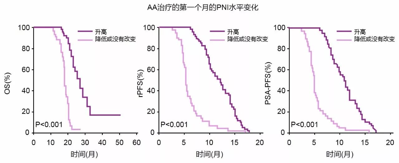 图2表明:AA治疗一个月后,70例mCRPC 患者的PNI值增加,42例下降或没有改变。在AA治疗第一个月后PNI值增加的患者显示更长的OS(26.8 vs. 17.8个月,P<0.001), rPFS (12.1 vs. 5.1个月,P<0.001) 和 PSA-PFS (11.0 vs. 5.1 个月, P<0.001)