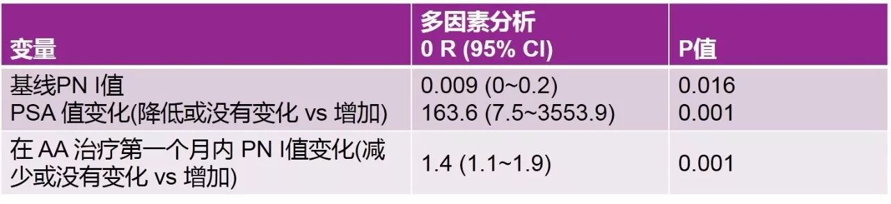 2. 在多变量逻辑回归分析中,基线高PNI水平,AA治疗第一个月PSA水平降低以及AA治疗第一个月PNI水平升高与AA治疗的初始反应显着相关(表1)。
