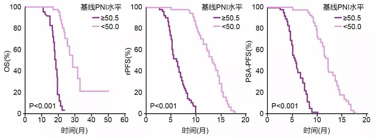 图1表明:基线PNI值≥50.5的患者较基线PNI<50.5的患者有更长的中位OS(28.4 vs 6.1个月,P < 0.001), rPFS (18.4 vs 12.1个月),PSA-PFS(13.2 vs 5.4个月,P < 0.001)