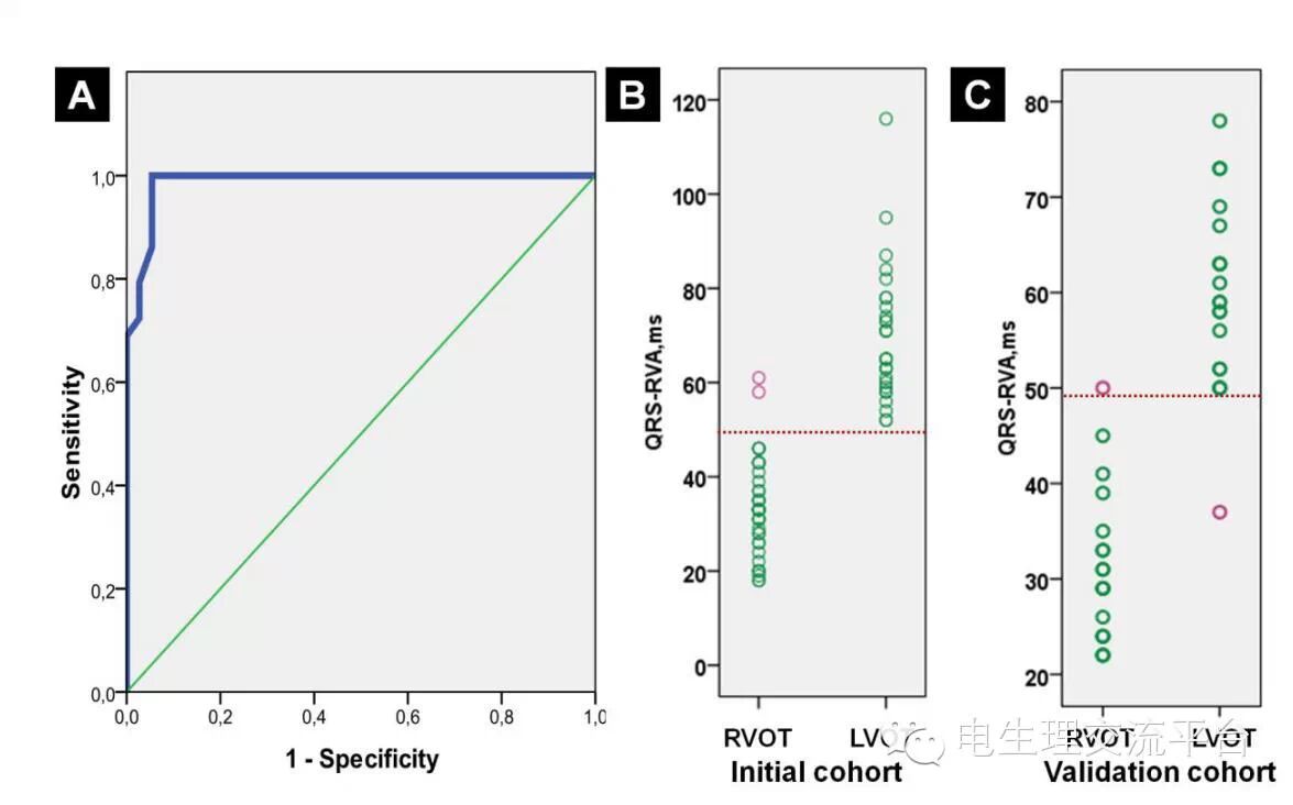 德国莱比锡中心发表在最新《Heart rhythm》介绍了一种较简单的鉴别方法。初始了测量66例患者(37例RVOT)体表心电图QRS起始点至右室心尖部电极远端记录信号的间期(QRS-RVA interval)。此外还前瞻性采用该方法判定39例患者其室性心律失常的起源位置(19例RVOT)。结果发现LVOT-PVCs的QRS-RVA间期长于RVOT-PVCs(70±14 vs. 33.4±10, p<0.001)。ROC曲线分析QRS-RVA间期≥49 ms诊断LVOT的敏感度、特异性、阳性预测和阴性预测值分别为100%, 94.6%, 93.5%, 100%。