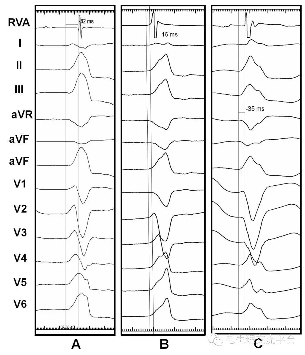 图2. 3例室早患者的12导联体表心电图和QRS-RVA间期,其中A例起源LVOT,B、C两例起源于RVOT。注意到3例患者胸导联移行区间相似。