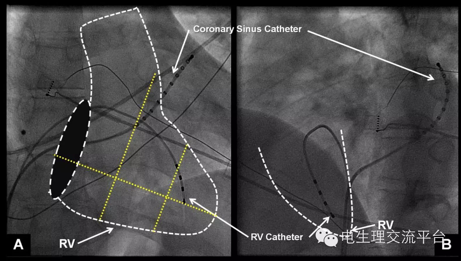 图1. 右(A)、左 (B)前斜位展示了右室和冠状窦电极位置。点线代表右室轮廓,椭圆形黑盘代表三尖瓣环。右室电极远端必须标准化放置在右室心尖部。