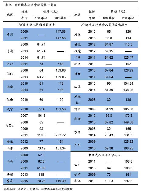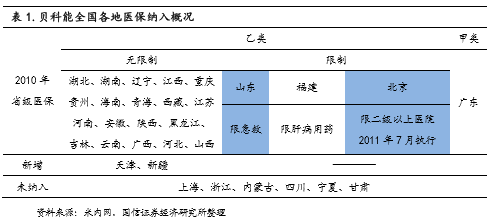 贝科能目前共被25个省市纳入医保,2010年以来新增天津与新疆两个地区,但仍有诸如上海、浙江、四川等医药大省重点地区未纳入医保,与此同时,山东、福建、北京、广东对于贝科能的医保使用仍存在部分限制。