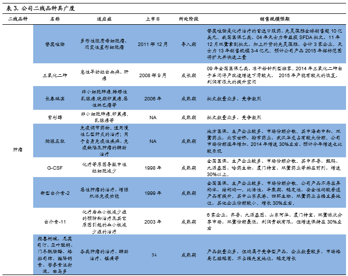 目前公司各个阶段的产品储备丰富,在肿瘤、血液病、抗感染及肝病、心脑血管、糖尿病等治疗领域形成有突出竞争优势的产品群。拥有众多潜力产品,包括长效蛋白药物、特色的专利药、高端疫苗、Me-too、Me better重组药和特色生化药物等。
