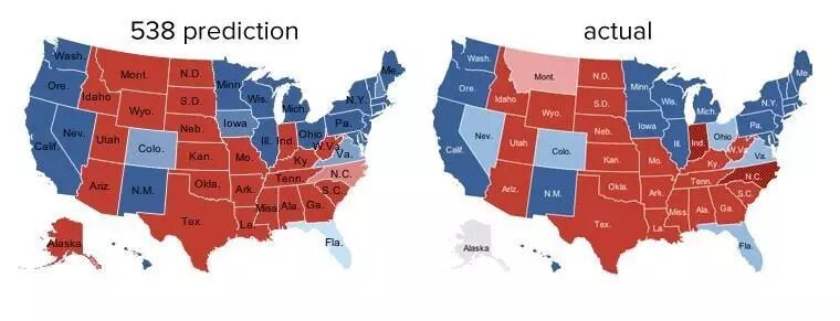 图4. Nate Silver对2012年美国大选的预测(左)和实际结果(右)的对比(红色的地方表示共和党获胜的州,蓝色的表示民主党获胜的州)