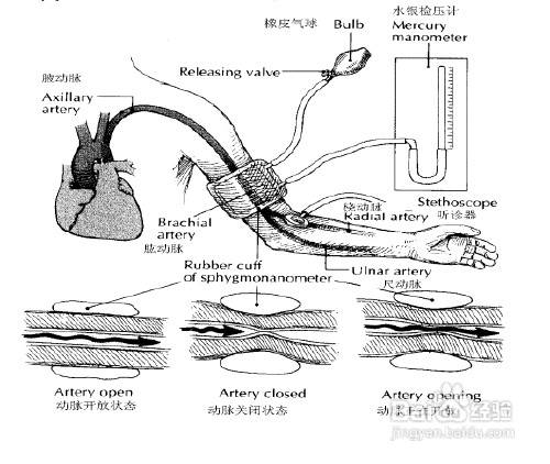 先对袖带充气至完全阻断肱动脉,缓慢放气,当听诊器中出现第一声脉搏搏动声,此时水银柱对应的刻度值即为收缩压,最后当脉搏声突然变弱或者消失,此时水银柱对应刻度值为舒张压。