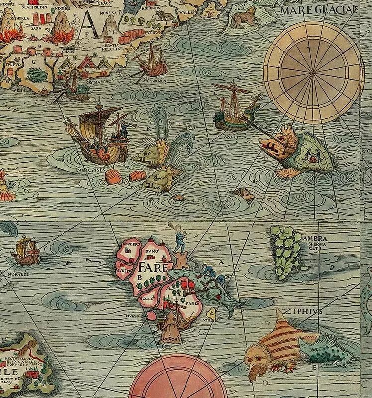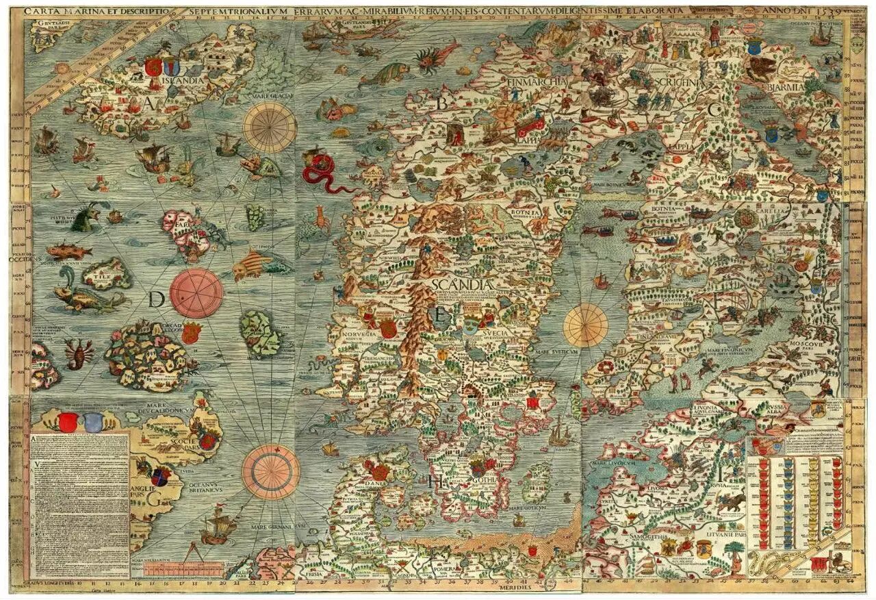 奥劳斯·马格努斯《海图》(1539)中的细节;“伊斯兰迪亚”(Islandia)位于图中左上角。图源:维基