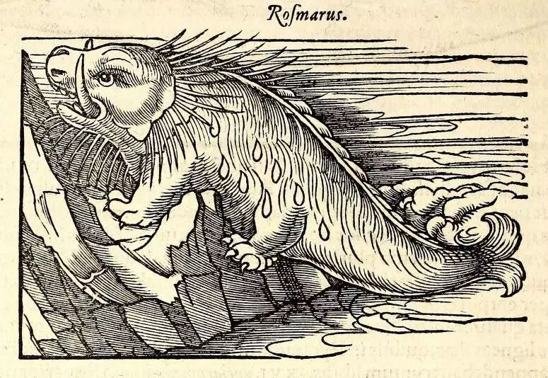 奥劳斯·马格努斯(Olaus Magnus)在其1555年所著的《北欧民族史》(A History of the Northern Peoples)中,为这段关于海象(rosmaro或morse)的描述配了一幅木刻图,其中绘有一只四足、生着野猪獠牙、面覆厚重胡须的生物紧贴崖面的场景。这位瑞典牧师并未亲眼见过这样一头恐怖的野兽,但为了营销此等奇事,素材来自其他受敬重的学者的记述,倘若确有其文的话,便具有了更多价值。 这些学者的记述显然允许了马格努斯创造出一种更奇幻的产品,从而更好地达到他的目的。