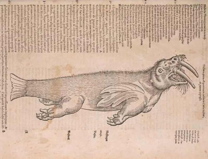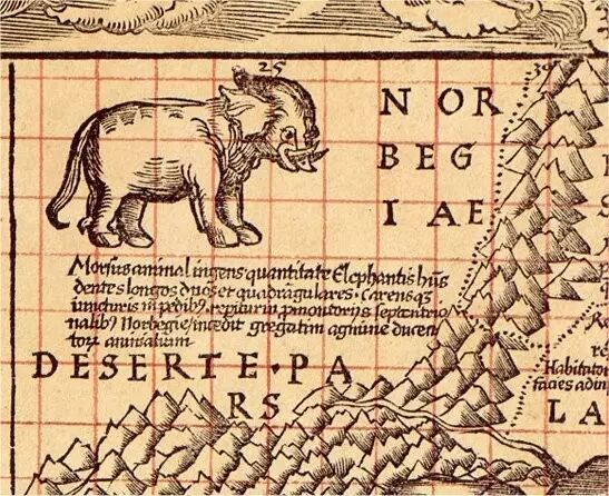 生着獠牙的两栖野兽——也许建立于海象的形象之上,也许不是——存在于十六世纪各类学术作品中。其中的一些源于经典权威:普林尼记述过一种“海中之象”,有时人们会将海象认定为这种动物。即便是在在现存证据相互吻合的情况下,这种一致性并不代表所陈述的便是事实。在马丁·瓦尔德塞米勒(Martin Walderseemüller)于1516年所绘的世界地图中像大象一样的“morsus”,大概便是这些令人困惑的名字及欧洲大陆与俄国进行的象牙贸易的产物。