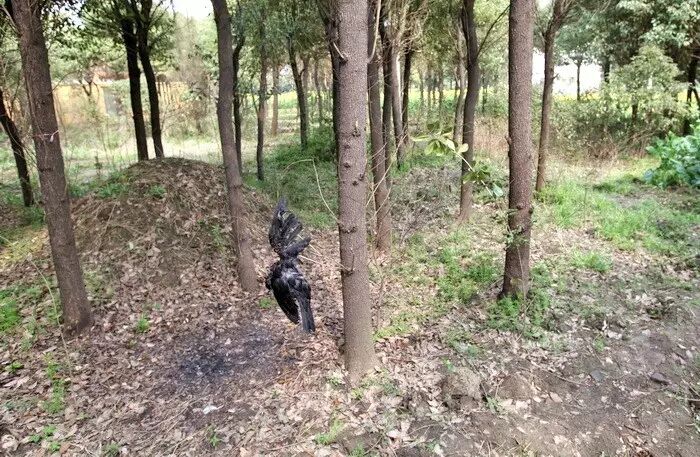 继续向树林深处走去,刚走出不远,竟然看到有一只黑色的大鸟悬停在半空中,这让我吓了一跳。走到跟前细看,原来在这密林之中,有人设置了几十米长的粘网,这只大鸟正是撞在此网之上无法挣脱而死去者。我真不明白下粘网者的目的究竟是什么,哪怕能够网上几只鸟,这又有什么用处呢?都是生命,活在这世上都不容易,还是高抬贵手的网开一面吧。