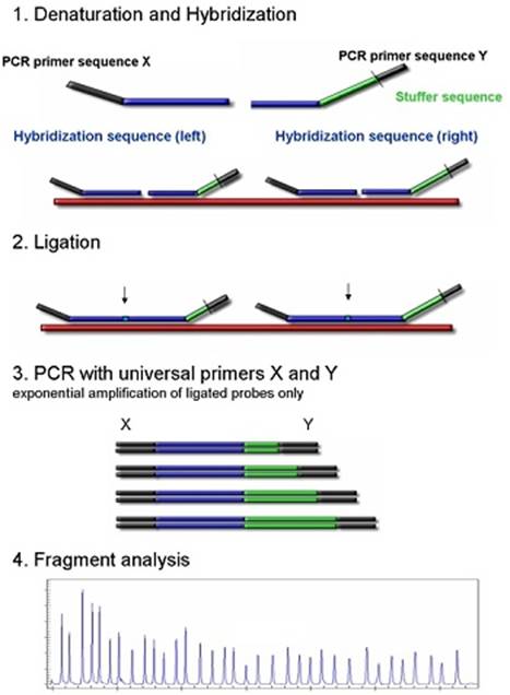 把连接引物和样品DNA混合,加热、退火,目的是让连接引物与目标DNA相结合。加入连接酶,进行连接反应。加入PCR荧光探针,和PCR酶,进行PCR反应。然后,把PCR产物用毛细管电泳进行电泳,检测带荧光的PCR扩增片段。