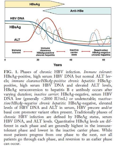 免疫耐受期之后是HBeAg阳性的免疫活动期,此期的ALT升高。在相应的干预后,HBeAg 血清学转换HBeAb出现,大多数患者转变为非活动的携带期,此期ALT水平转为正常,血清 HBV DNA 水平降低或处于未能检测水平。在某些患者中,血清 HBV DNA 和 ALT 水平会再次升高,在数年或数十年之后。这些患者被认为处于“HBeAg阴性免疫活动期”,主要的表现为 HBV DNA 和 ALT 水平波动。在非活动携带者中HBeAg阴性免疫活动性肝炎平均发生率为0.37%。一些患者并不完全按照这些阶段发展。