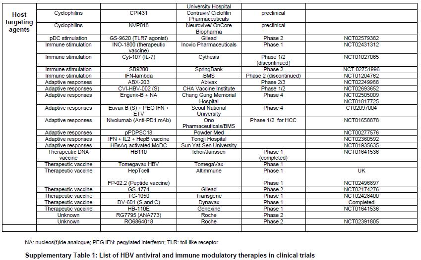 治疗性疫苗的目标是刺激或增强宿主免疫应答以恢复免疫控制,实现对HBV复制的持续抑制并最终导致HBsAg的消失。具有或不具有强效佐剂的常规HBsAg疫苗,T细胞疫苗,HBsAg和人类抗HBs的免疫复合物,表达HBV抗原的凋亡细胞,DNA疫苗和表达HBV蛋白的病毒载体的治疗性疫苗策略已被评估具有有限的成功。病毒载量高的患者反应较差,肝硬化患者可能会导致免疫性肝炎产生的高风险。用NAs进行预处理以抑制HBV复制可能会增强HBV特异性T细胞应答并预防炎症发生。GS-4774是一种表达HBV S / C / X融合蛋白的热灭活酵母基疫苗,在健康志愿者中能诱导HBV特异性T细胞应答,但是在NAs病毒抑制的慢性乙型肝炎患者以及那些未经治的患者中未观察到HBsAg降低和HBsAg消失。下面是一系列正在临床试验的治疗性疫苗。
