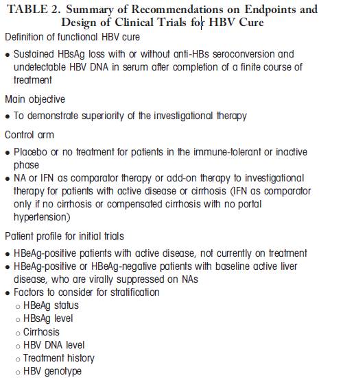 Table 2中列出了关于HBV治愈临床试验终点和设计的建议摘要。增进对HBV生命周期和对HBV宿主免疫应答的了解有助于发现和设计直接针对多个HBV复制周期的抗病毒疗法,及恢复对HBV感染免疫应答的潜在免疫调节疗法。通过改进细胞和动物感染模型的可用性,将进一步帮助开发新型HBV疗法。虽然这一进展已经提高了治愈乙型肝炎的可能性,但是由于存在整合HBV DNA,要想实现完全清除病毒的治愈,即从宿主中将病毒彻底根除可能是不切实际的。虽然HBsAg清除不常见,但在用NA和IFN治疗期间确实发生了,并且与临床结局改善有关。因此,在使用新型抗病毒和免疫调节治疗进行有限的治疗后,实现功能性治愈(特征是:HBsAg的持续消失伴随或不伴随抗HBs血清转换)的患者比例比现有疗法达到的要高,这是一个可达到的目标。