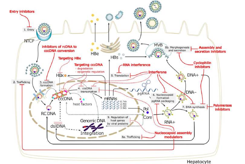开发新型疗法的目标是实现慢乙肝的治愈,例如,清除乙肝病毒,从而允许实现无病毒反弹和肝病进展风险的停药。然而,面临的一个事实是,由于HBV DNA整合到宿主基因组中,治愈也就变得不那么容易实现;某些即使已经从急性 HBV 感染中康复的人,仍然可以在肝脏中检测到共价闭合环状状DNA(cccDNA)的存在,一旦这些已经“康复”的人的免疫系统受到深度的抑制,乙肝病毒就会再次激活重新复制。然而,急性乙肝感染中临床康复的,慢性乙肝感染自发性清除的,在核苷(酸)类似物或干扰素治疗期间或治疗后的这些人的血清中是无法检测到乙肝表面抗原(HBsAg)的,尽管存在HBV基因组持续整合的可能性,实现HBsAg水平的无法检测的可行性仍然有争议。