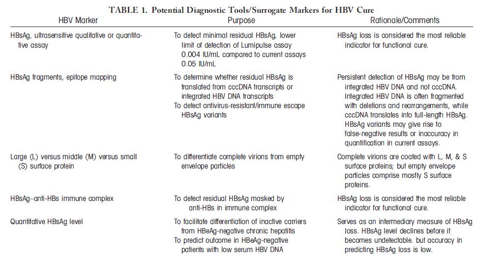 HBsAg消失被列为新型抗病毒和免疫调节疗法的phase 3期试验的最重要的疗效终点。有些专家建议需要更敏感的 HBsAg 方法。另外专家则指出,血清中HBsAg水平的持续存在可能不是来自持续的cccDNA转录,而是来自整合的HBV DNA基因组。现在需要一种可以区分源自整合HBV DNA的HBsAg还是源自ccc DNA的检测方法。在血清中不能检测到HBsAg并不代表着就关闭了HBsAg的产生,因为循环的HBsAg可能与抗HBs以复合物的形式存在。乙型肝炎病毒产生空白包膜颗粒,其病毒粒子数可能超过1,000倍。可以区分病毒体中的表面蛋白与亚病毒颗粒(大,中,小HBsAg蛋白)的方法将是有益的。
