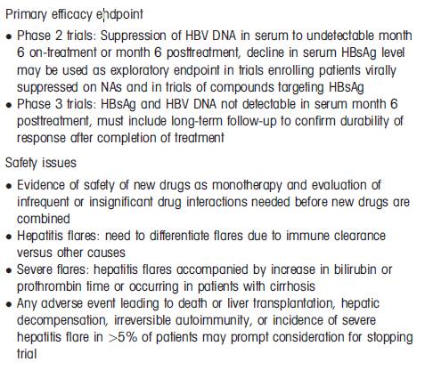 原先的干扰素和NA类药物试验以生化学,病毒学,血清学和病理学终点来评估有效性,而更近期的试验已经专注于病毒学和血清学终点,因为这些终点已经显示出跟临床结局的改善有相关性。由于缺乏正常ALT的标准化定义,生化终点的使用是有问题的。此外,随着肥胖和非酒精性脂肪肝病的流行率的增加,ALT正常化的失败可能不一定表明HBV引起的肝脏炎症持续。事实上,NAs的phase3期临床试验一直发现,达到生化学终点的患者百分比低于病毒学应答终点。在评估肝脏疾病中肝脏纤维化的无创评估在临床实践中取代了肝活检,评估功能性治愈组织学终点或将不再实用或必须。然而,在概念验证研究中可能需要肝组织活检查来确认新的作用模式和/或验证抗病毒活性的非侵入性替代标记物。