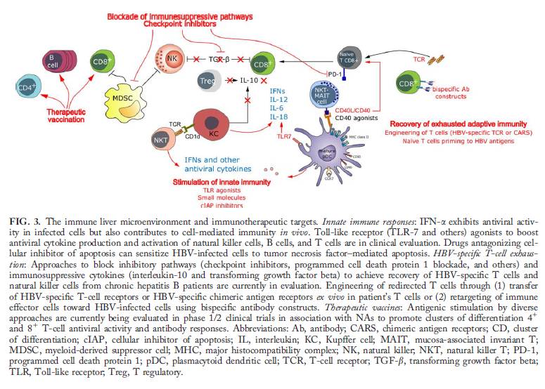 精心设计激起的先天和适应性免疫反应是感知和控制HBV感染所必需的。在慢乙肝患者中,通过诱导先天的促炎反应和细胞因子应答是非常微弱的。在急性肝炎患者中发现了自然杀伤细胞产生的IFN-γ,但在慢性肝炎患者中未能观察到。在慢乙肝患者中,HBV特异性T细胞对于HBV控制来说是必须的(它在肝脏炎症中或许还起着一定的作用)同时也是功能失调的,或许是被耗竭或删除。它们表型的疲惫被认为是持续的表面抗原的暴露进而增加了T细胞抑制应答的抑制,这给专注于降低HBsAg的产生提供了理论基础。由于慢性乙型肝炎中B细胞功能障碍的表征不足,因此接受抗集群分化治疗的患者HBV复发率高,这表明B细胞在慢性乙型肝炎的免疫控制中发挥作用。因此,现在提出了通过调节免疫产生或恢复HBV特异性免疫应答的几个潜在靶标,. 3)。现在免疫调节治疗的主要问题是担心诱导不受控制的肝脏炎症和自身免疫反应。