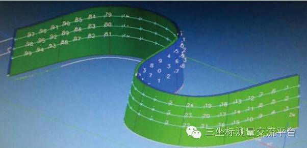 确定“S”试件测量目标点位理论数据,测量点位应选择能够最大包容“S”试件形位特征的点;其次,所选点位需考虑测量行程中的安全。遵循这两大原则,并结合“S”试件的结构特点,将“S”件自底面向上,每10mm 取一截面,共可以取三个截面,每个截面的边界成为一条曲线,在每条曲线上每25mm 间隔至少取一点,这样,就在整个形体上获得99 个点位,以这些点位作为测量目标,来完成试件的测量。