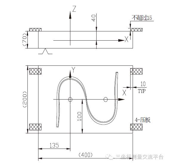 “S”试件测量坐标系建立的工艺图如图4。按照图中指示,利用3-2-1 方法建立测量坐标系,如图