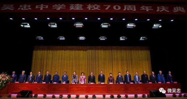 在主席台就坐的各位领导和嘉宾,他们是:、宁夏大学党委书记、校长、吴忠中学62届毕业生陈育宁先生;教育厅常务副厅长撒承贤同志;吴忠市人大常委会副主任马银静同志;吴忠市人民政府副市长王慧仙同志;;教育厅财务处处长马维皋同志;吴忠市教育局党工委书记、局长周少云同志;吴忠市人民政府教育督导室主任高瞻同志;吴忠市教育局副局长周占忠同志;吴忠市教育局副局长蒯文普同志;吴忠市教育局副局长张进存同志。