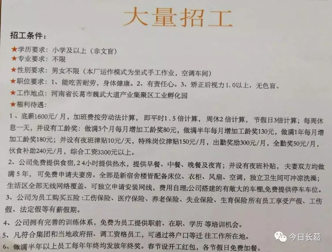 要求:身体健康,态度端正,女工35岁以下,男工40岁以下,有无经验均可。待遇:工资+季度福利+节日福利+公休