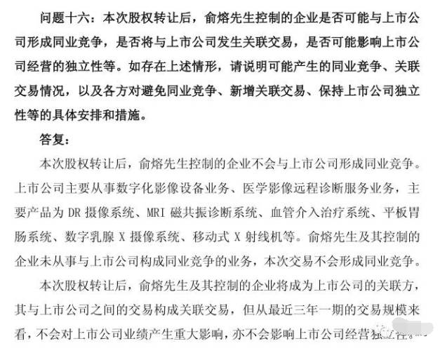 3日后,即2017年4月13日,万东医疗收到上海证券交易《问询函》,要求万东医疗就公司控股股东江苏鱼跃科技发展有限公司(以下简称“鱼跃科技”)与俞熔先生股权转让的有关事项作进一步补充说明和解释。问询的焦点是:上述股权转让后,俞熔控制的美年大健康,是否可能与万东医疗存在同业竞争?是否将与万东医疗发生关联交易?是否影响万东医疗的独立性?